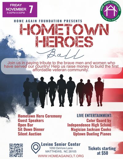 Our Hometown Heroes Ball is going to be a night to remember! Join us for an unforgettable evening as we honor one special hometown hero and raise funds to build the first truly affordable housing community for our nation's heroes.